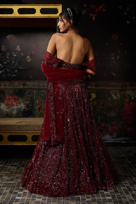 Maroon Tulle Beads, Embroidery Off-shoulder Tonal Embellished Lehenga Set