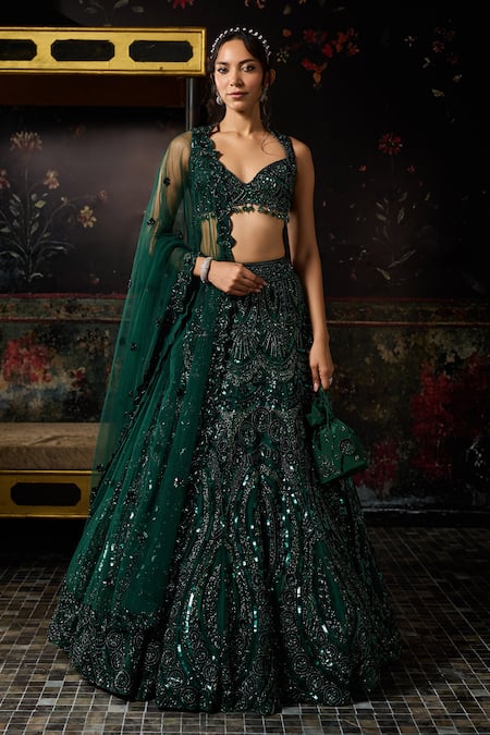 Green Tulle, Crepe, Shantoon Sequins, Beads, Tonal Embellished Lehenga Set