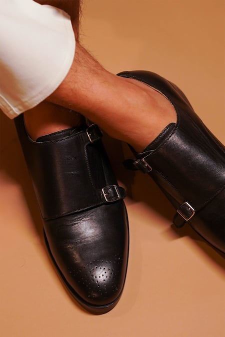 Black handcrafted monks with double buckles straps, almond toe & broguing detail.