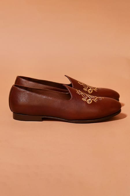 Brown leather shoes featuring intricate golden embroidery