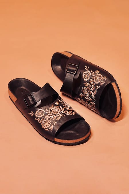 Black slipper sandals featuring floral zardozi embroidery and cork sole. Designed with a comfortable fit and a stylish aesthetic.