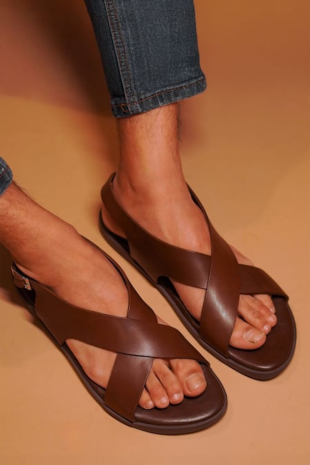 Brown leather sandals featuring an open toe design with criss-cross straps and ankle buckle straps