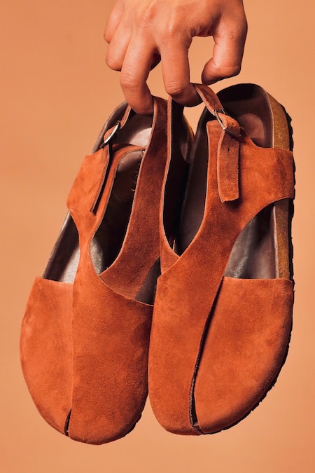 Brown Peshawari sandals featuring overlapping strap design and cork sole