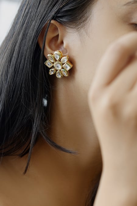 Gold plated flower shape studs featuring Kundan embellishments in various shapes