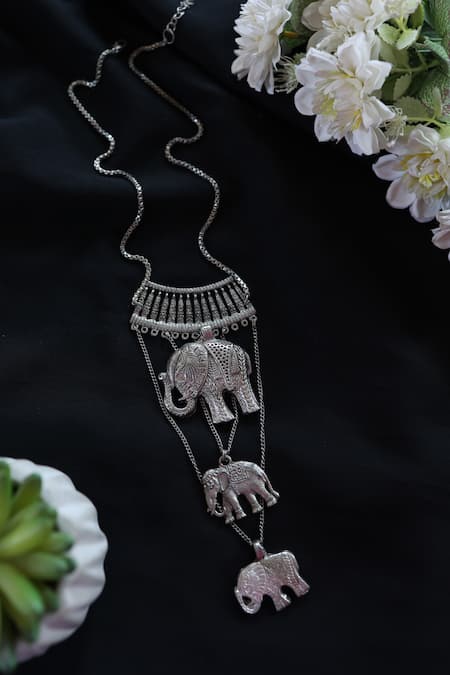 Silver tone oxidized necklace featuring carved half-moon patterns and elephant motifs