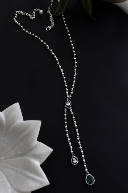 Silver alloy necklace featuring faux diamond embellishments and a green glass crystal surrounded by cubic zirconia stones