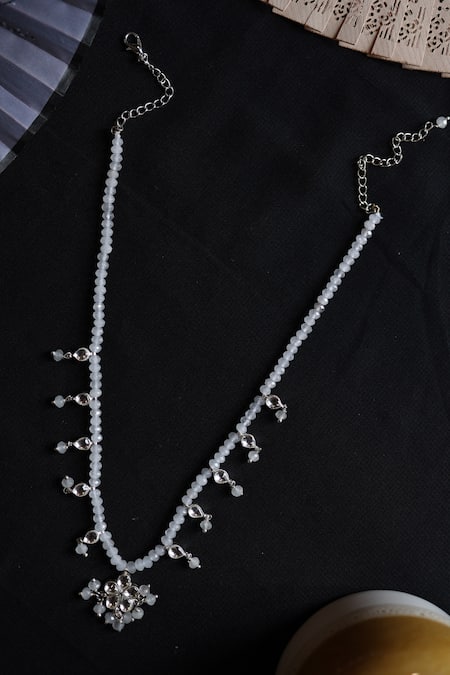 Lobster hook closure for secure wear, Clear kundan studded floral drop motifs, Rhodium plated silver tone finish