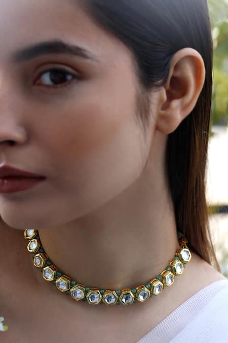 Gold plated choker featuring aligned kundans with shell pearls on top