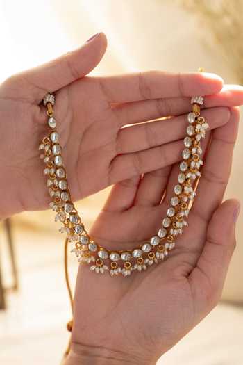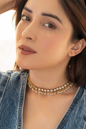 Gold choker necklace with kundan and pearl embellishments.