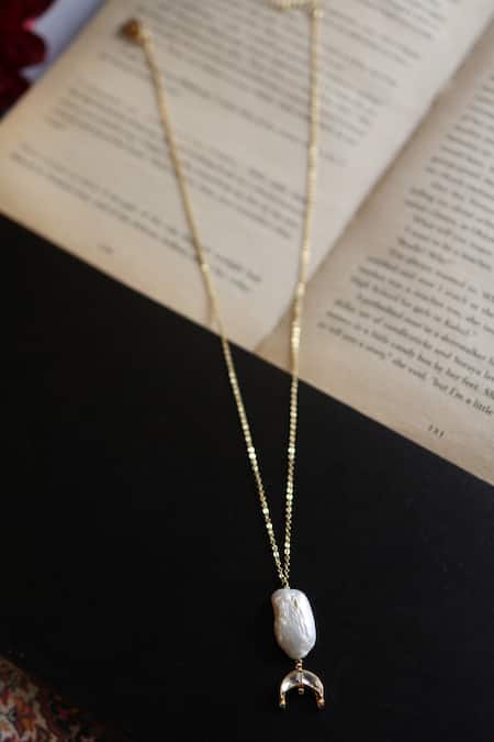 Crescent pendant design with baroque pearl detail, Kundan stone embellishments, Delicate chain with hook closure