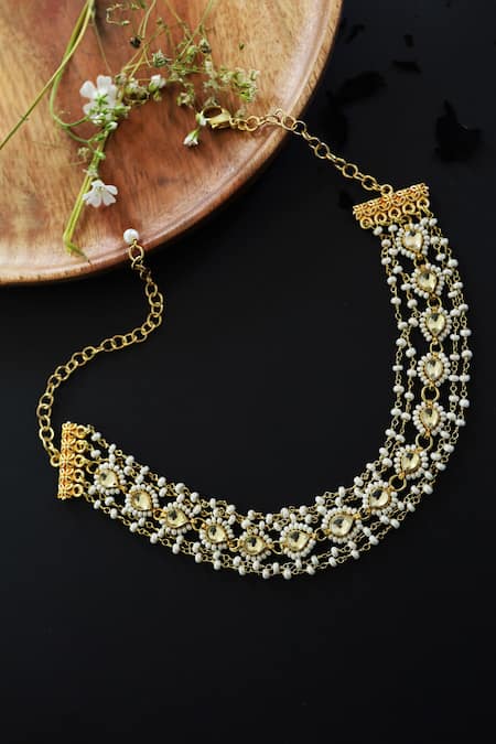 Gold layered choker featuring kundan drop center motifs and pearl multi-chains