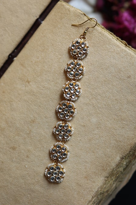 Gold maangtikka featuring kundan and seed pearl embellishments