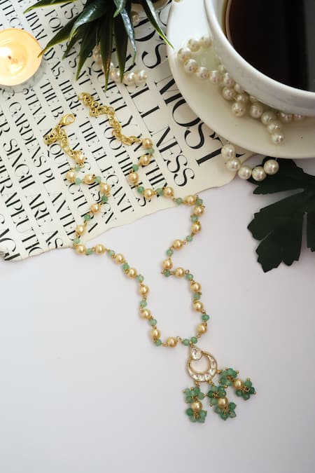22kt gold plated pendant necklace featuring green kundan and onyx stone embellishments