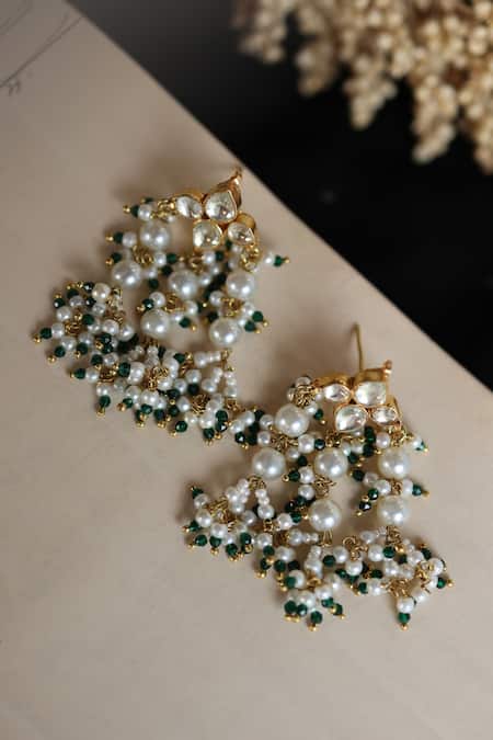 Gold plated earrings featuring a floral motif design adorned with kundan stones and dangling pearls, complemented by trinkets of green onyx