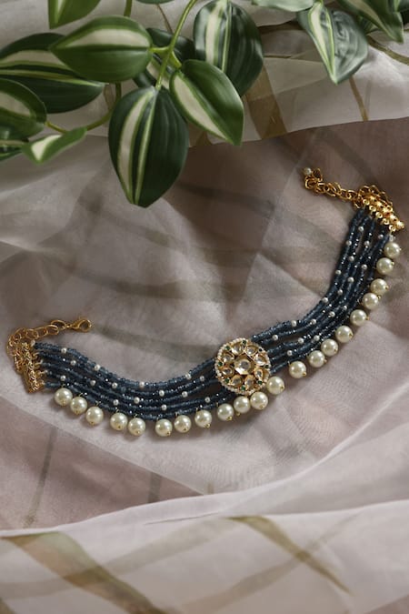 Blue choker featuring a kundan-studded floral pendant with pearl and onyx embellishments. Designed with multiple strands of blue beads and a lobster clasp closure.