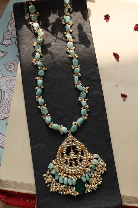Green long pendant necklace featuring turquoise kundan, pearl, and stone embellishments