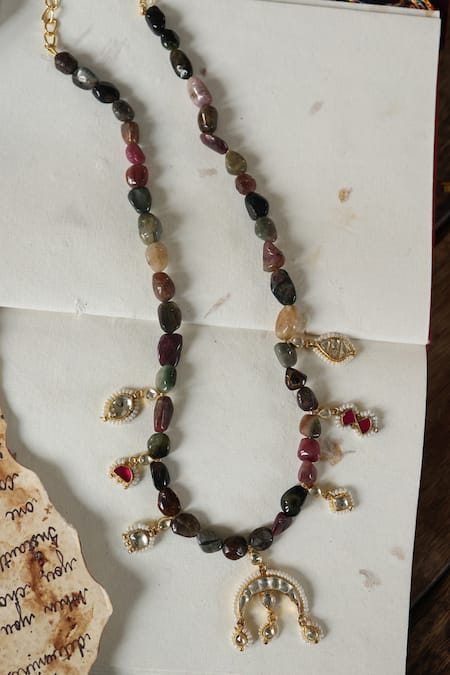 Multi color pendant necklace featuring a half crescent carved pendant adorned with kundan, pearl, and tourmaline stone embellishments