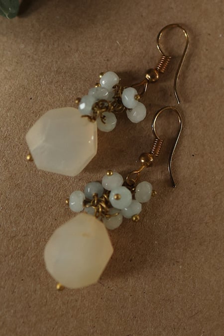 White drop earrings featuring natural stones and onyx embellishments