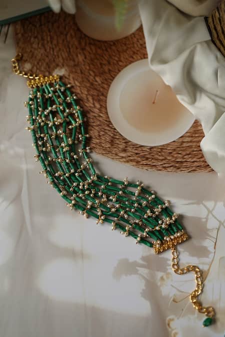 Green Natural Stone Embellished Multistrand Choker Necklace