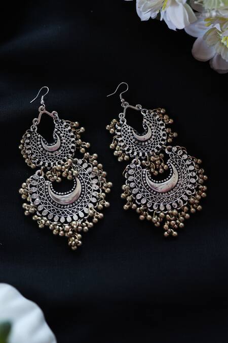 Silver tone oxidized chandbali dangler earrings featuring carved dot patterns and lined with ghunghroo