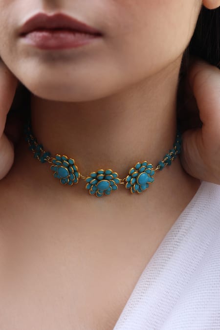 Gold plated silver alloy choker featuring blue natural stone embellished flowers