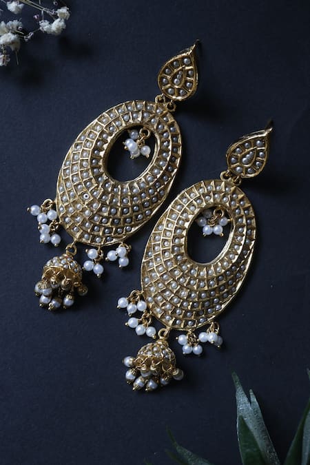 Gold chandbali earrings featuring crescent shape with cut work details and encrusted pearls