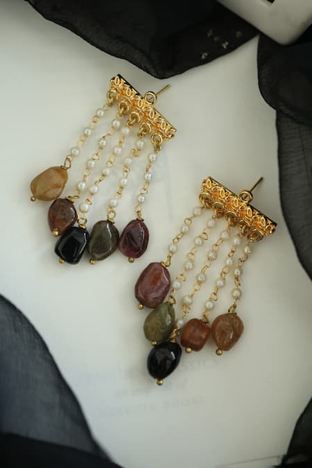Gold plated earrings featuring a string of pearls and multi-color natural stones embellishments