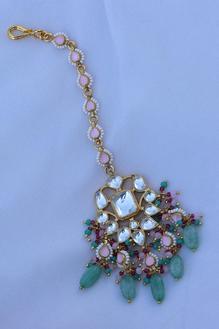 Gold plated maangtikka featuring floral carved design with blue natural stone, polki, and onyx embellishments