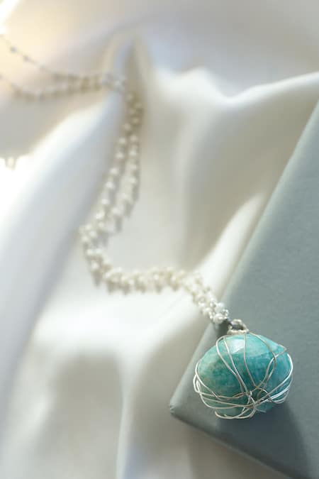 Turquoise blue stone drop pendant necklace featuring a pearl-strewn chain