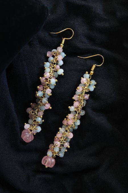 Pink dangler earrings featuring clustered pink and blue onyx stones embellished with natural stones and drop tassel details