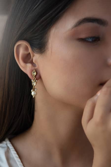Gold plated drop earrings featuring layered tear drop motifs with kundan embellishments and pearl drop tassels