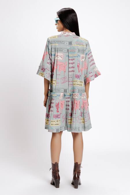 Grey shirt dress featuring a multi-color bantai print with a knife pleated hem