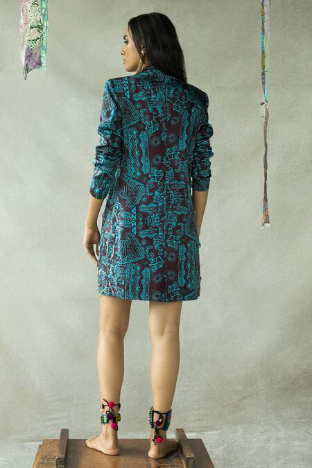 Printed blazer dress featuring a lapel collar, full sleeves, and front button closure
