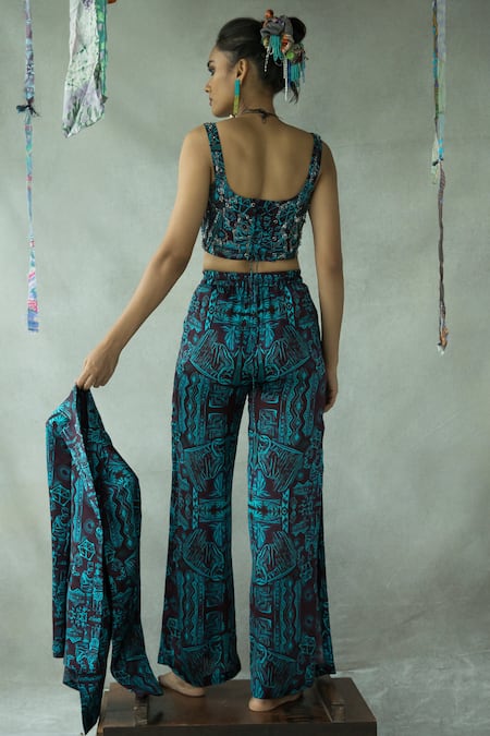 Blue and brown printed trouser made from cupro satin featuring side slits