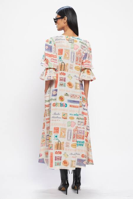 Puffed sleeves with a relaxed fit, Deep V-neckline for a stylish look, Unique graphic print design throughout the dress