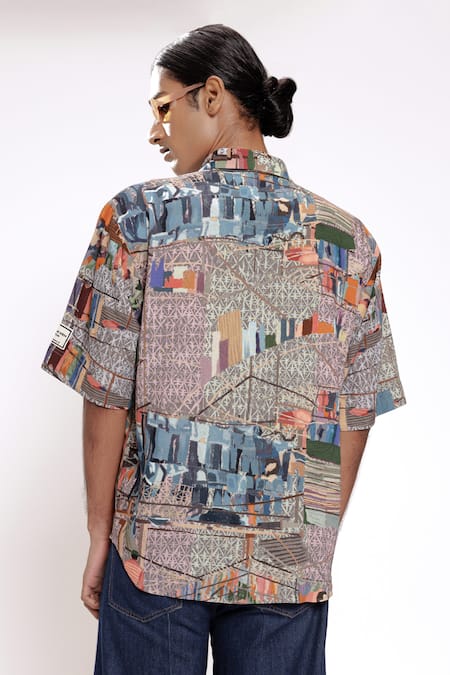Grey shirt featuring a dhobighat inspired print with half sleeves and a collar
