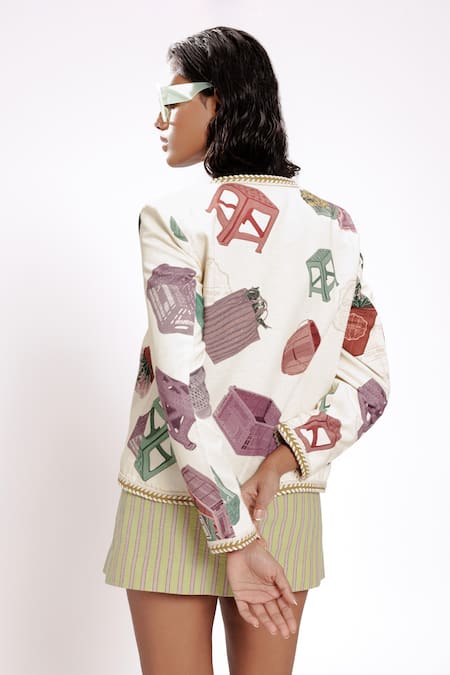 Ivory jacket featuring a flower market print with braided trim along the edges