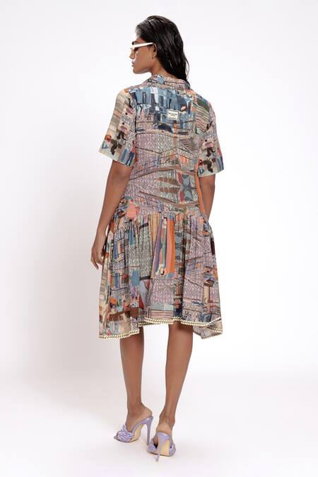 Gray Rayon Open Neck Grey Scenic Print Asymmetric Gathered Dress