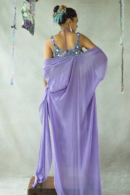 Lilac hand embroidered corset featuring a square neckline and lined design. Paired with a maxi draped skirt and a cape with an embroidered border.