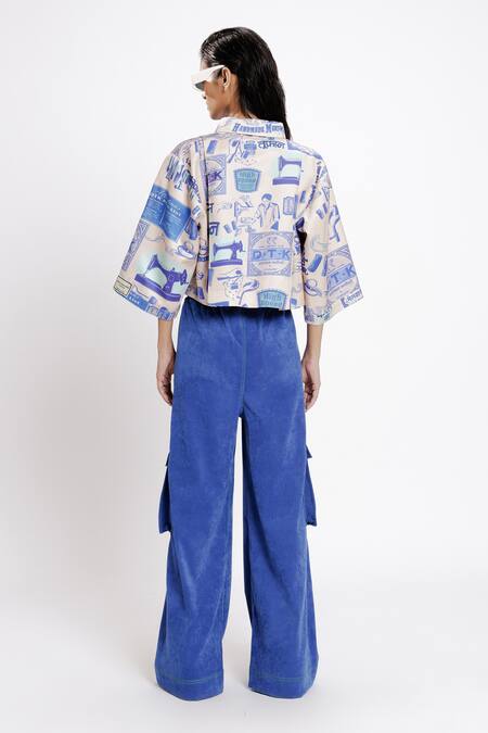 White boxy oversized crop shirt featuring blue karkhana print and baggy sleeves