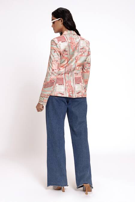 Mint green structured blazer featuring studio printed patterns, welt pockets with flaps and back hemline vent