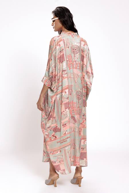 Mint green kaftan featuring studio printed patterns with front button detail and side slits