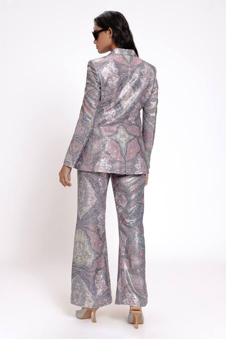 Purple bell bottom pant featuring matte sequin embellishment in abstract pattern with contrast cord piping