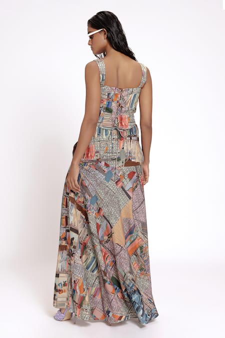 Gray Rayon Square Neck Scenic Print Grey Corset