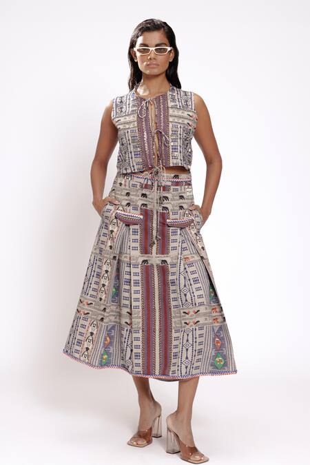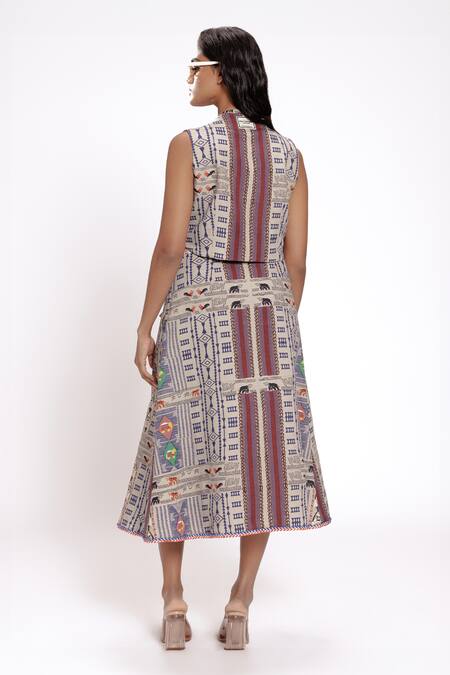 Front tie-up closure, Glass bead and tassel embellishments, Tribal geometric and animal motifs