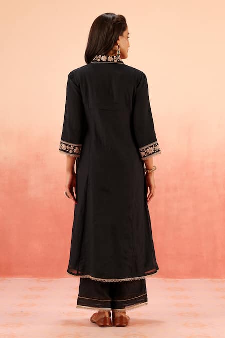 Black kurta featuring intricate embroidery along the neckline and sleeves. Paired with matching pants and a coordinating dupatta.