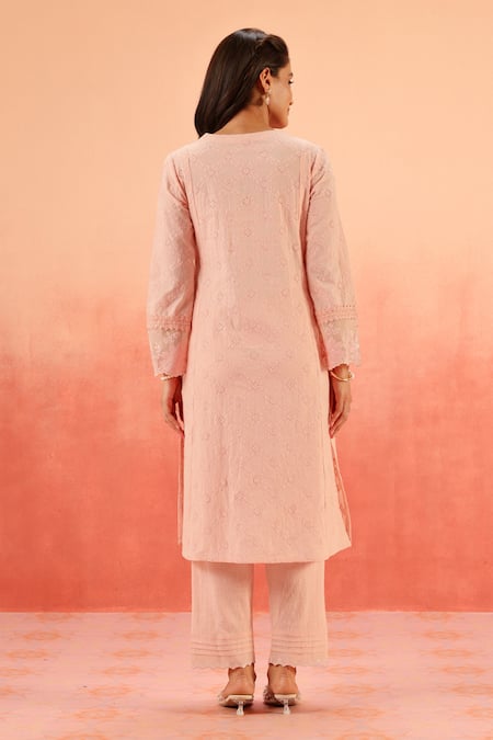 Pink kurta featuring cotton schiffli fabric with intricate embroidery. Paired with matching cotton slub pant and a lightweight kota dupatta.