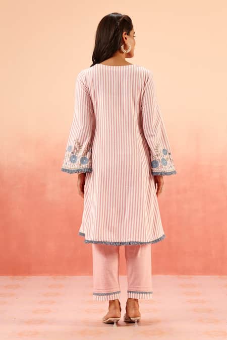 Pink kurta featuring cotton slub stripes with embroidery and frill details. Accompanied by matching cotton slub striped pant and a Bemberg jacquard dupatta.