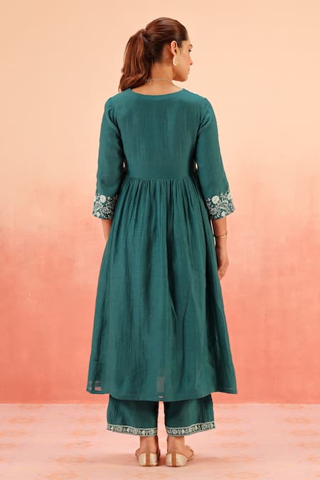 Teal green Anarkali featuring intricate embroidery and a flared silhouette. Paired with matching pant and dupatta made of cotton silk.