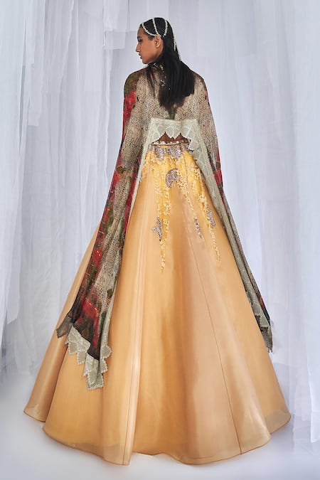 Yellow Organza Pearls, Sequins, Aaleyah Printed Cape Embroidered Lehenga Set